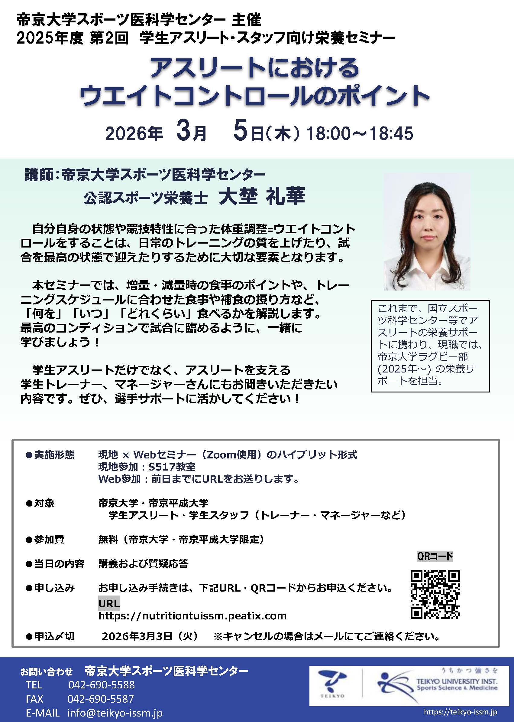 帝京大学スポーツ医科学センター 主催 2025年度 第2回 学生アスリート・スタッフ向け栄養セミナー